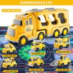 - 【EASY TO USE】- just gently push the large construction vehicle forward and they will run forward on their own. It can set off with up to 6 mini cars! Your toddler can also open the tailgate and unload the mini-vehicle. In addition, push the mini car toys forward and then let go and they will run forward on their own. The construction truck cab and the trailer behind can be separated at will, and the front end of the big truck can be turned. The pull-back design makes them go faster!